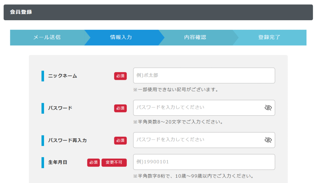ニックネームやパスワード、生年月日など登録に必要な情報を入力したら本登録完了です。
