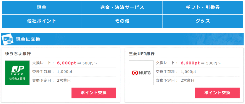 ポイントの交換先には、現金、送金・決済サービス、ギフト・引換券などがありますので、希望する交換先を選択します。