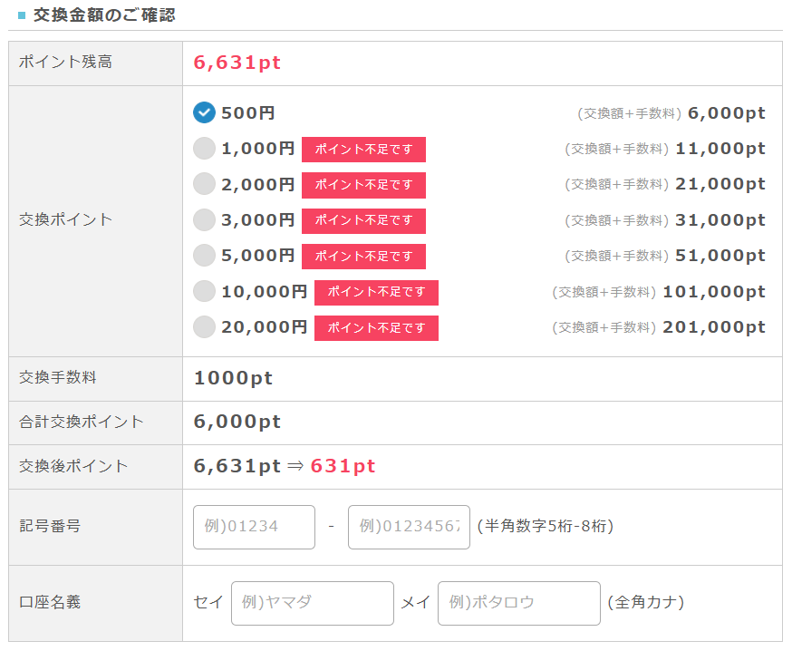 下記のような入力画面が表示されるため、交換したいポイント数を選択し、記号番号や口座名義等必要な項目を入力。