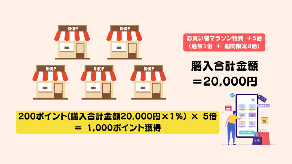 ここでは分かりやすさを優先して、「通常ポイント1倍+買いまわり特典」だけで試算します(SPUや各種キャンペーンは含めません)。