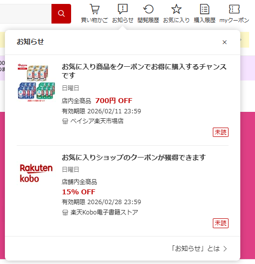 お気に入りした商品やショップからの情報が更新されると、楽天市場トップページのナビゲーションにお知らせ通知が届きます。