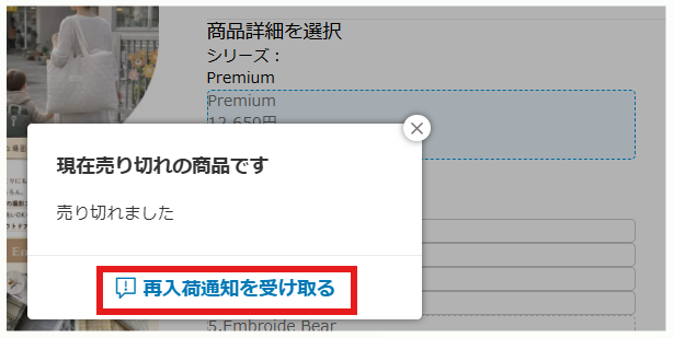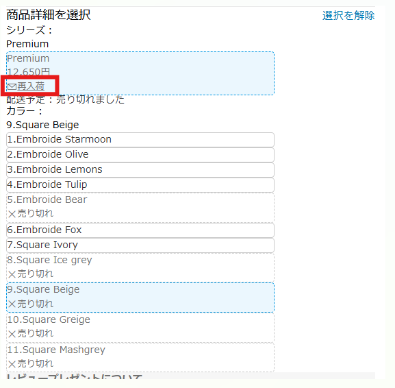 ➡商品が売り切れの場合は、商品選択エリアに「再入荷ボタン」が表示されます