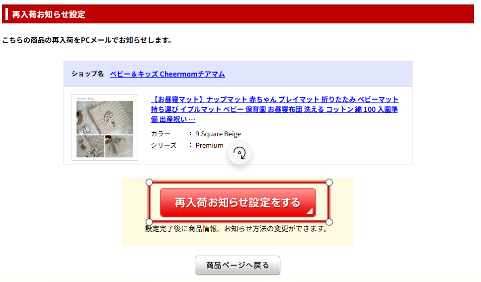 ③「再入荷お知らせ設定をする」のボタンを選択する