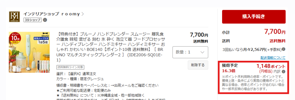楽天市場にて購入したい商品を選び、カートに入れて、購入手続きを行います。