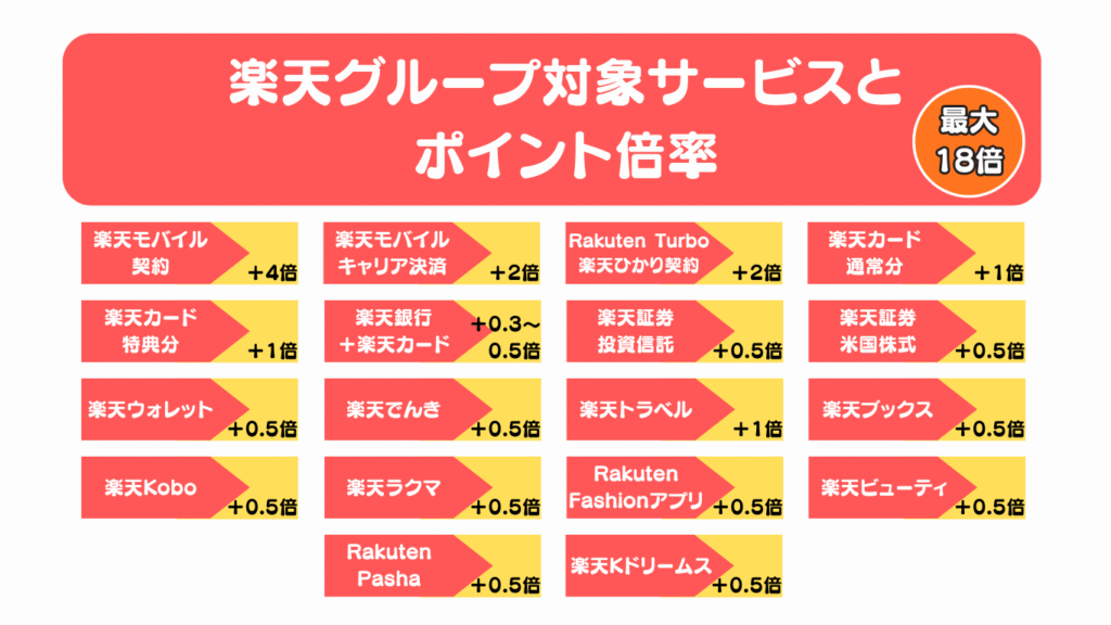 楽天SPU(スーパーポイントアップ)とは、楽天グループの対象サービスを利用している場合に、楽天市場での買い物時のポイント倍率が加算される制度です。