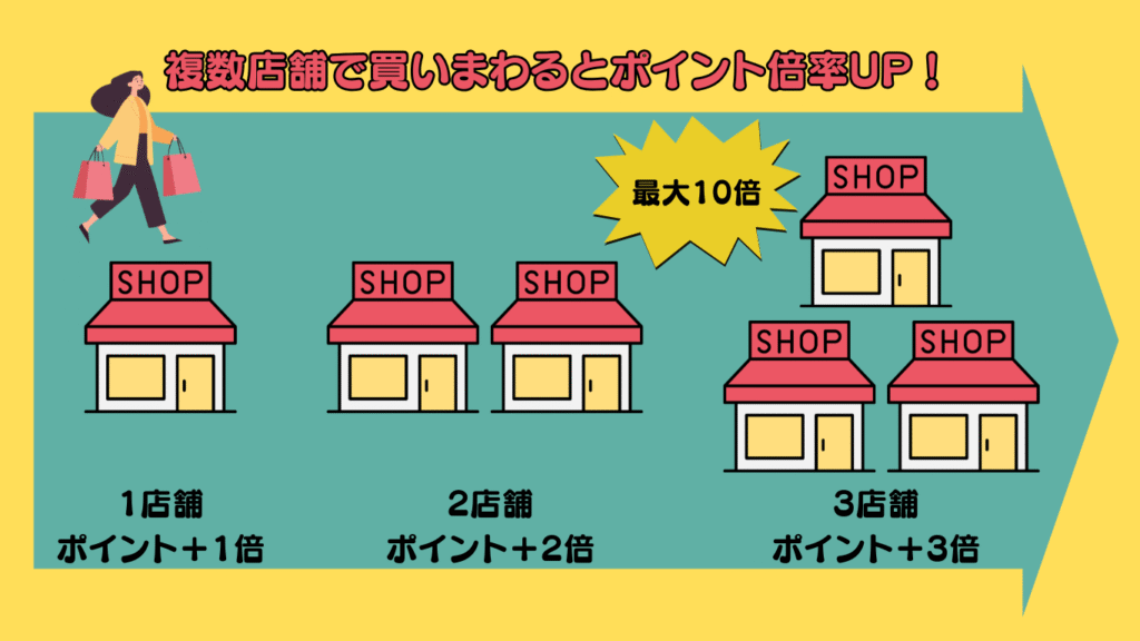 ①ショップ買いまわりで最大10倍のポイント還元